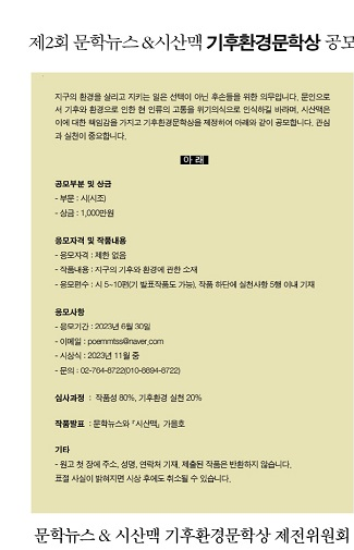공모명 제2회 문학뉴스&시산맥 기후환경문학상 공모 공모부분 시(시조) 상금 1,000만원 응모자격 제한 없음 작품내용 지구의 기후와 환경에 관한 소재 응모편수 시 5~10편기 발표작품도 가능) 작품 하단에 실천사항 5월 이내 기재 응모기간 ~ 2003년 6월30일 접수방법 이메일 poemmtss@naver.com 시상식 2023년 11월 중 심사과정 작품성 80%, 기후환경실천20% 작품발표 문학뉴스와 시산맥 가을호 주최 시산맥사 문의 02-764-8722