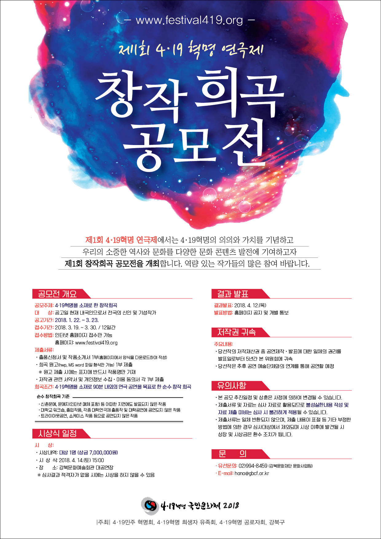 4·19혁명으로 완성한 민주주의를 문화와 결합하기 위해 제1회 4·19혁명 연극제 중 창작희곡공모를 개최하오니 전국의 신인 및 기성작가 여러분들의 많은 참여 부탁드립니다. [이 게시물은 한작협님에 의해 2018-04-02 20:28:02 자유게시판에서 이동 됨]