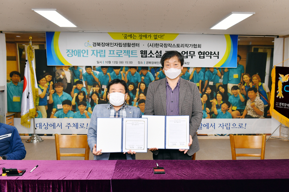경북장애인자립생활센터(이하 경북IL센터)는 지난 13일 (사)한국창작스토리작가협회(이하 스토리작가협회)와 웹소설 창작 교육을 위한 업무협약을 체결했다.